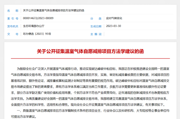 今年3月,生态环境部发布《关于公开征集温室气体自愿减排项目方法学建议的函》,向全社会公开征集温室气体自愿减排项目方法学建议,透露正在积极推进建设全国统一的温室气体自愿减排交易市场。
