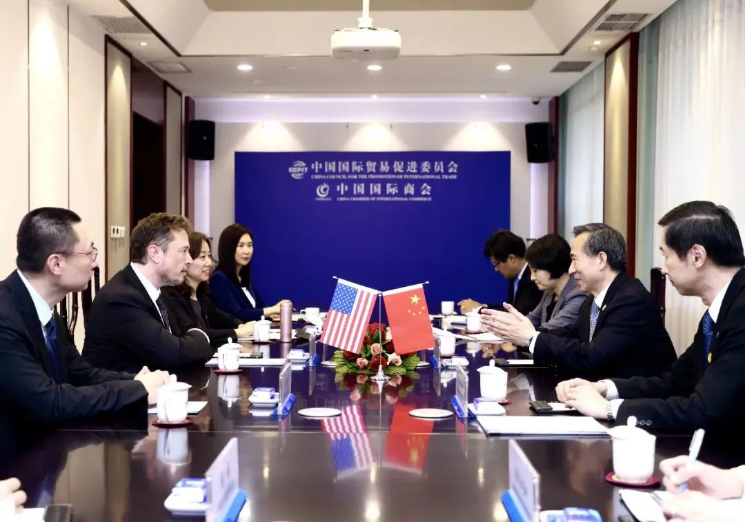 图说:中国贸促会会长任鸿斌会见特斯拉首席执行官马斯克