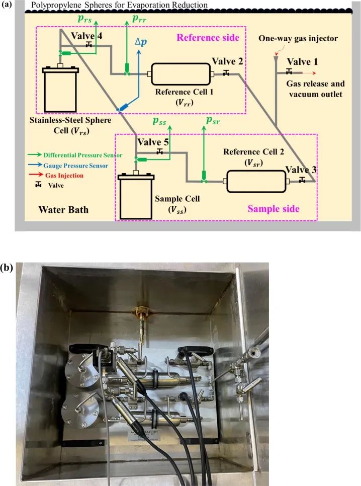 图说:用于氢吸附测量的装置设计和设置。(a) 改进体积法的示意图,(b) 在实验室中的实验装置