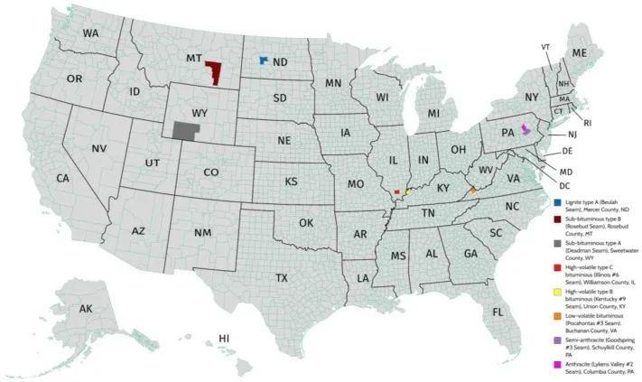 图说:研究人员选取了美国各地的八种不同类型的煤进行实验